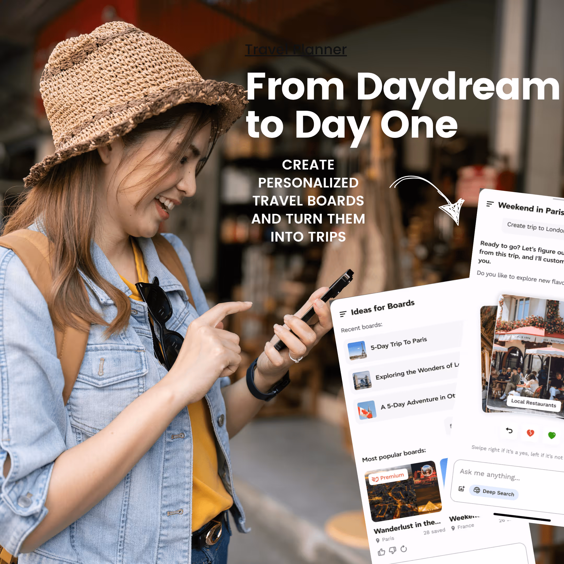 One tap turns your board into a flexible, AI-assisted travel plan (API-frendly).